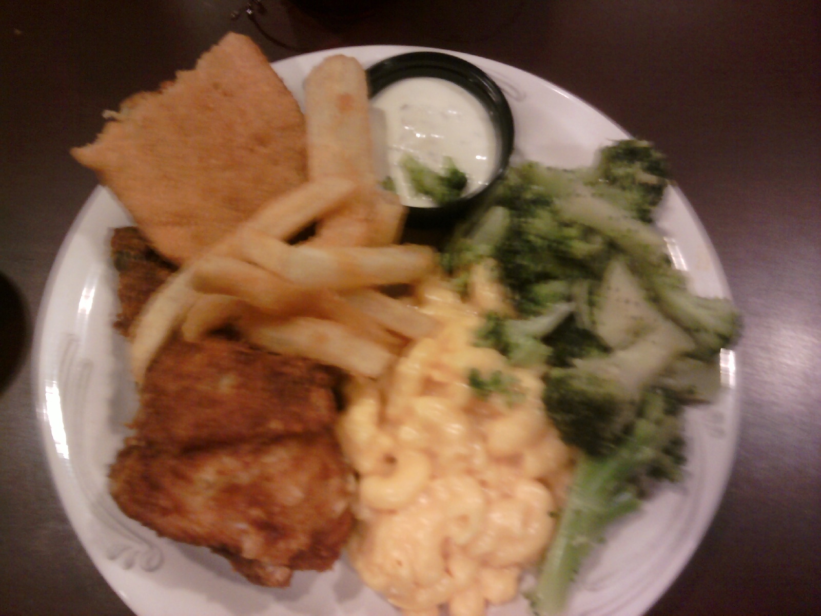 I'm proud of this plate, I really am. As you can see, only the far regions of the plate are unused, the regions where spills are always capable of occuring. Also, I used action research to decide that broasted chicken was worth another go. Combined with mac and cheese, fries, breaded haddock and broccoli. (Hate on me all you want, broccoli is money in the bank) But we are looking at one rather well rounded plate. Not too much of one item, but enough to get a solid taste.